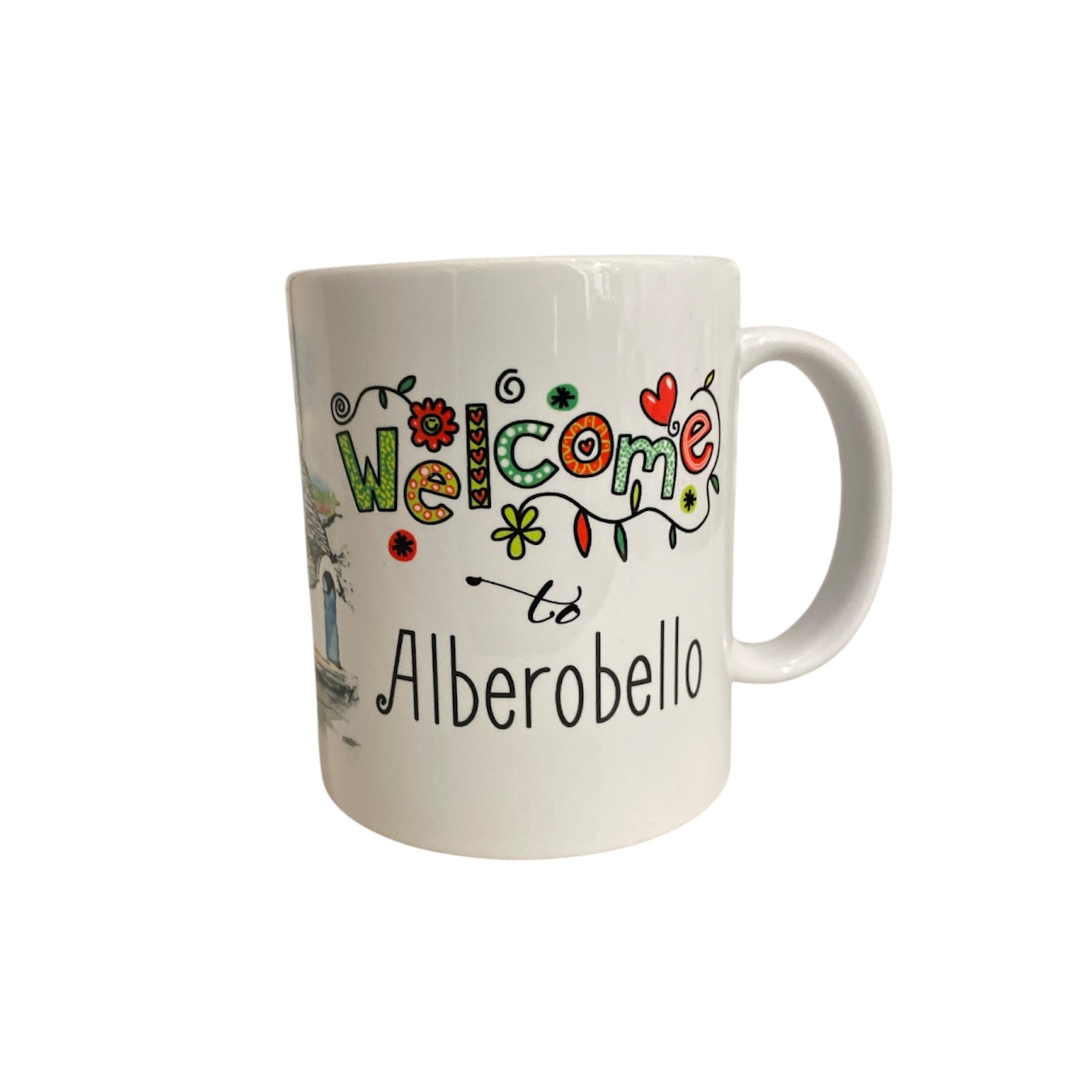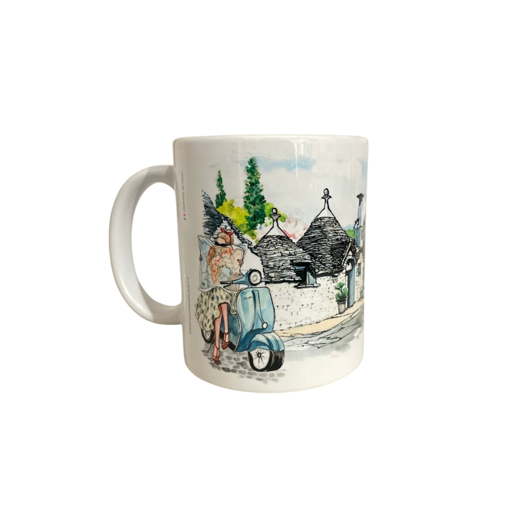 Tazza da latte/the in ceramica con il disegno della vespa e dei trulli .