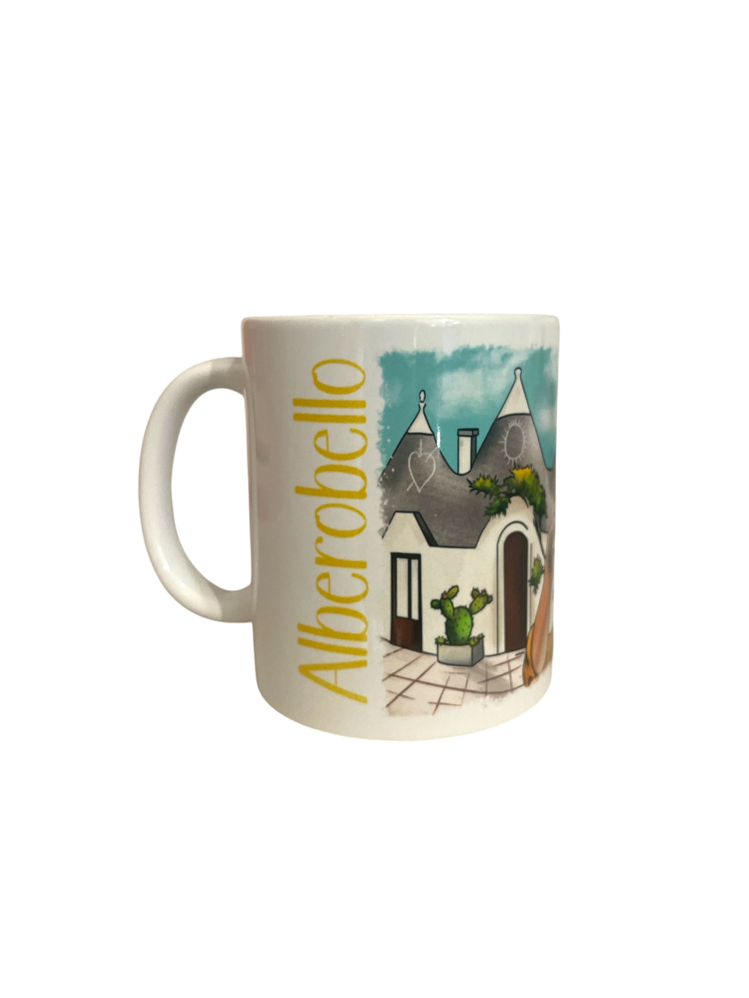 Tazzone da latte in ceramica con grafica dei trulli con personaggio .
